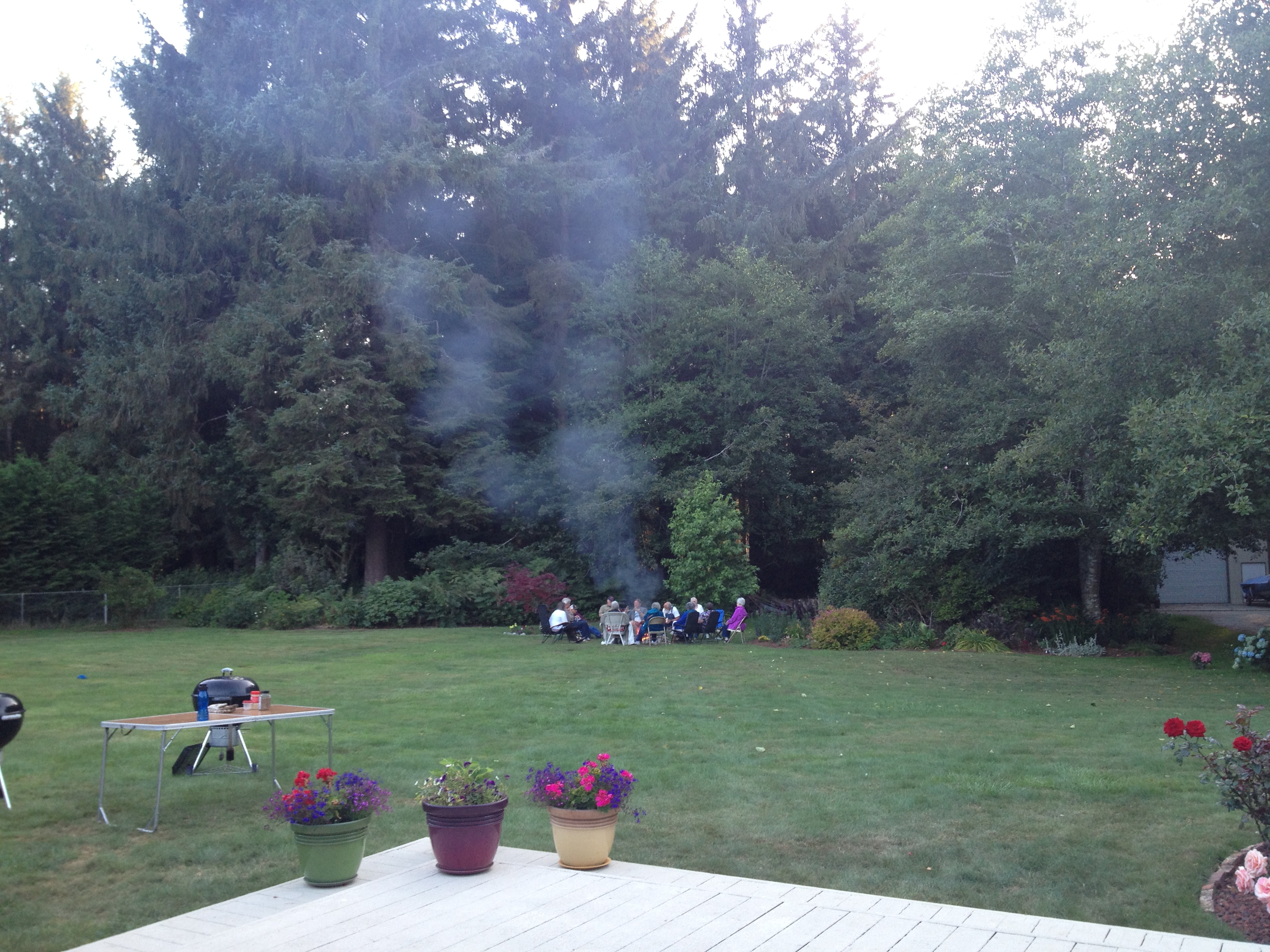 A view of Presler’s backyard edged with Redwoods. Yes, that’s a bonfire with a group of us chattering and laughing well beyond dark.