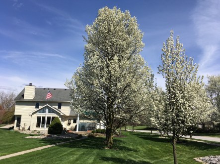 Some of the white, flowering, ornamental pear trees that line the left of our property.