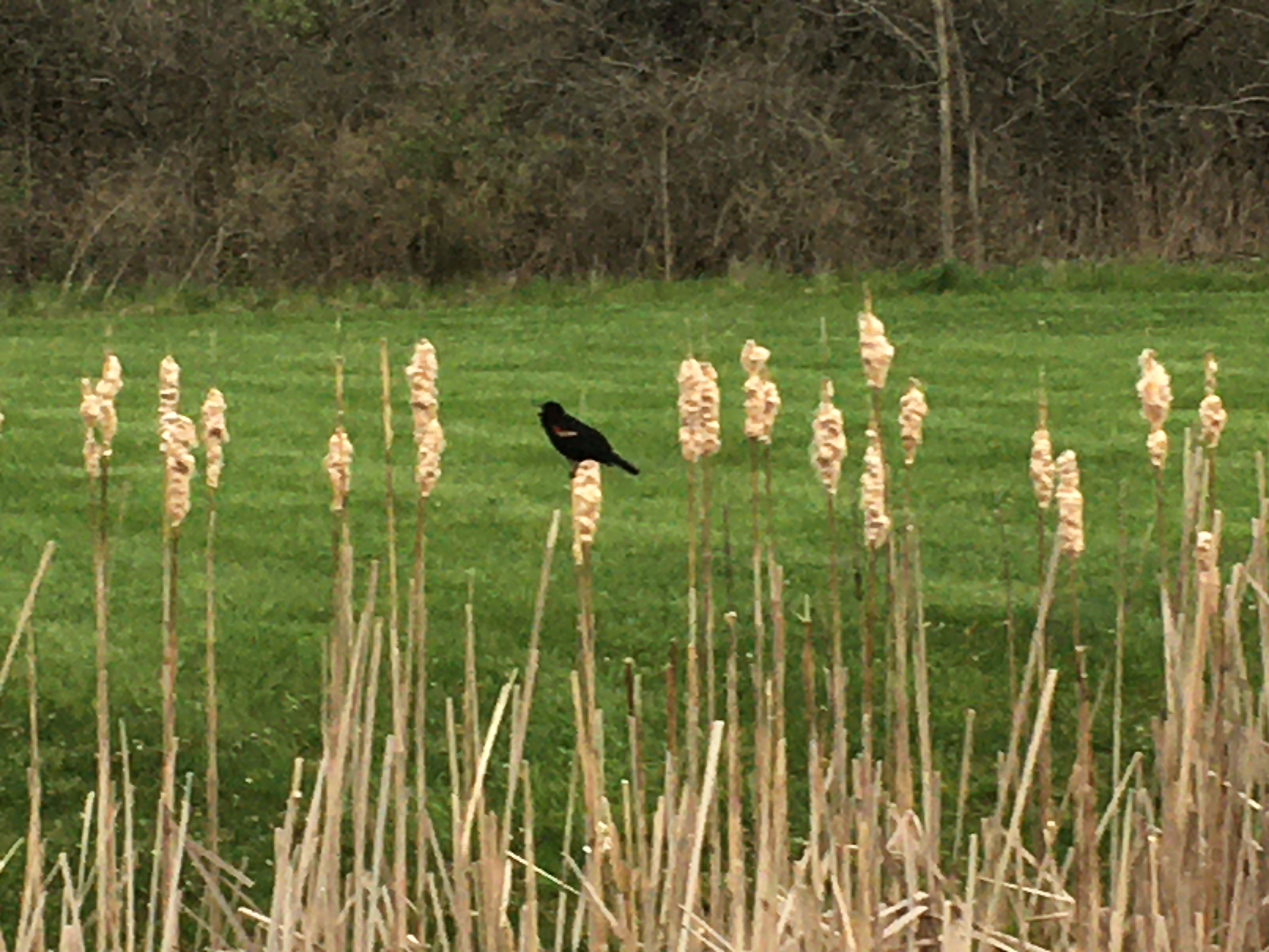 Further back of our property along the “creek” I watch this black bird with a red and yellow stripe on each side protecting his wife and nest below.