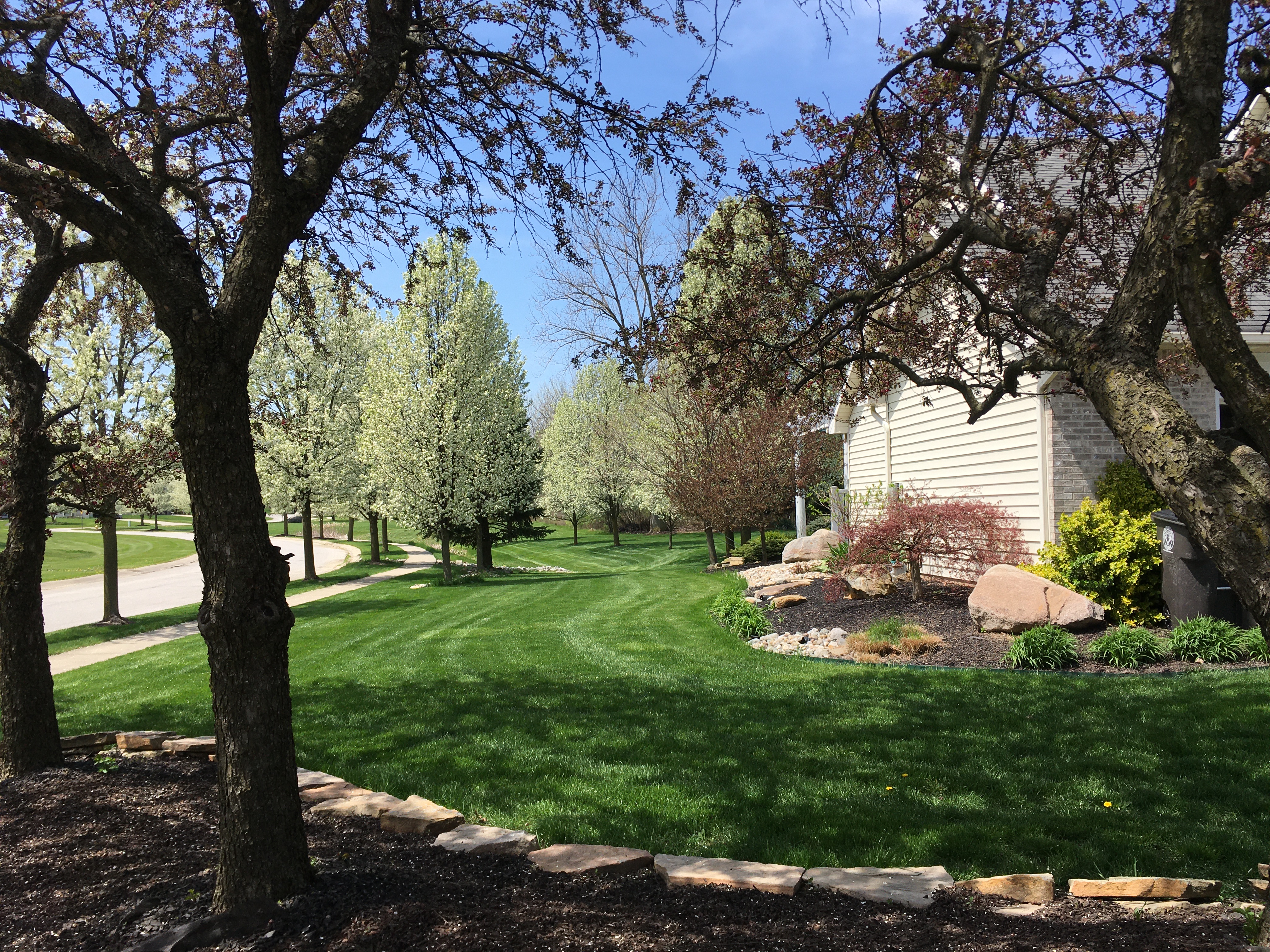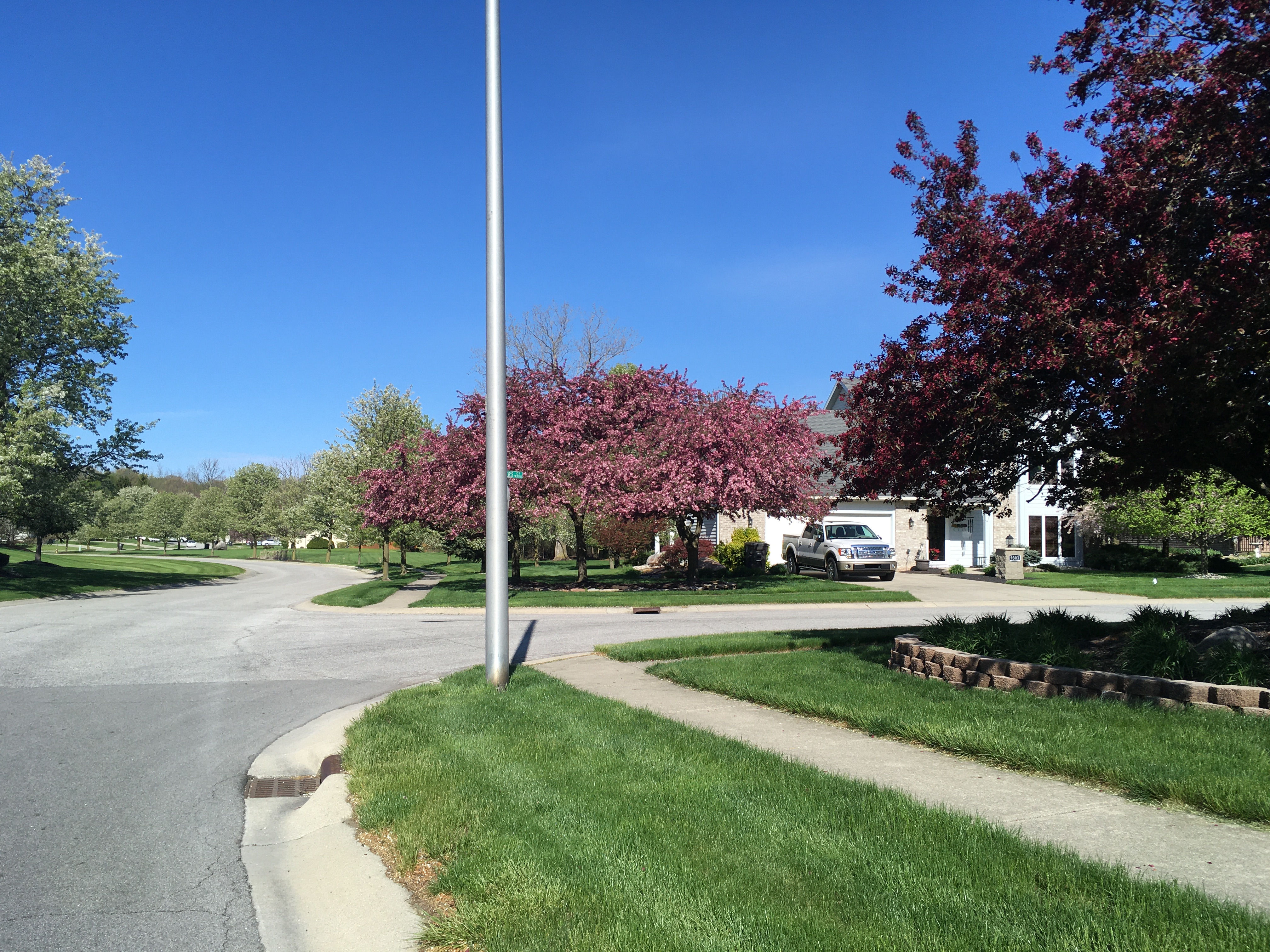 View from across the street looking toward the left side. The white, ornamental pear trees sing a solo for a few weeks before the ornamental cherry and crabapple blossom, creating a visual trio.