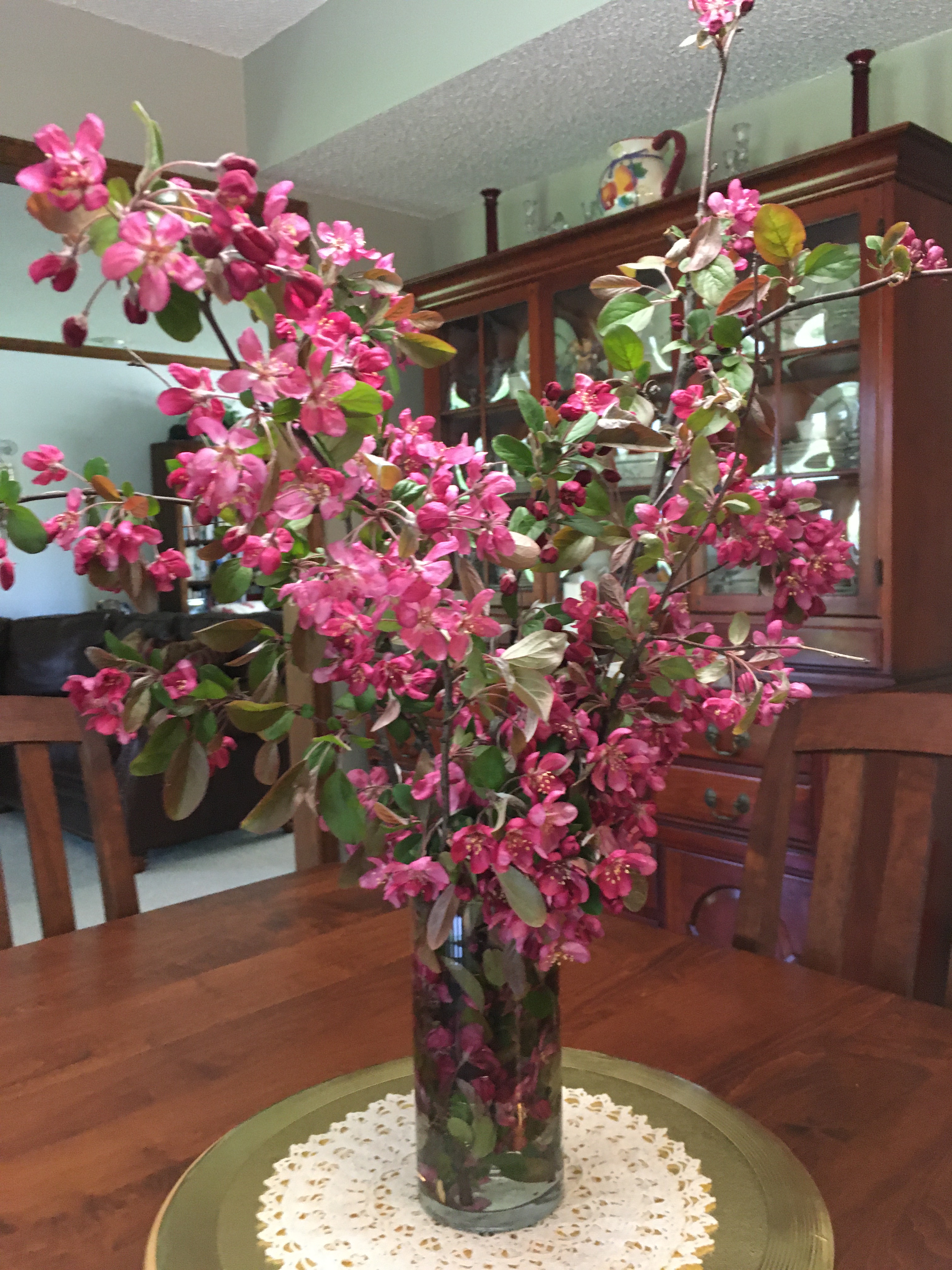A bouquet of ornamental cherry blossoms, from a few branches that Paul trimmed off the tree, decorate our dining room for a few days or a week. We’ll see how long they last.
