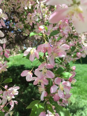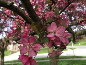 A week has passed during which we have experienced two days of  winter-retro: snow turned our green lawn white!! I put on a snuggly sweater. I wanted to start a blaze in the fireplace. Nonetheless, it was another gorgeous day– of a different sort.  Snow playfully dusted the pink and white blossoms of our ornamental crab apple and pear trees. “Hmm. If it keeps up,” I thought,  “we may receive much more that a light coating. I hope our plants and trees aren’t damaged.”