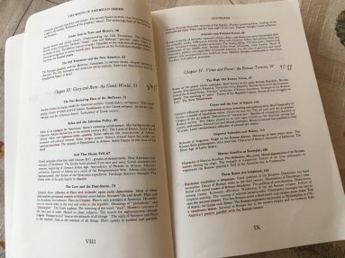The chapters develop like a genealogy, unfolding our heritage: (titles only) 2, The Law and the Prophets; 3, Glory and Ruin: the Greek World; 4, Virtue and Power: the Roman Tension; 5, the Genius of Christianity; 6, The Light of the Middle Ages; 7, The Reformers’ Drum; 8, The Constitution of Church and State; 9, Salutary Neglect: the Colonial Order; 10, Eighteenth-Century Intellects; 11, Declaration and Constitution; 12 Contending Against American Disorder.