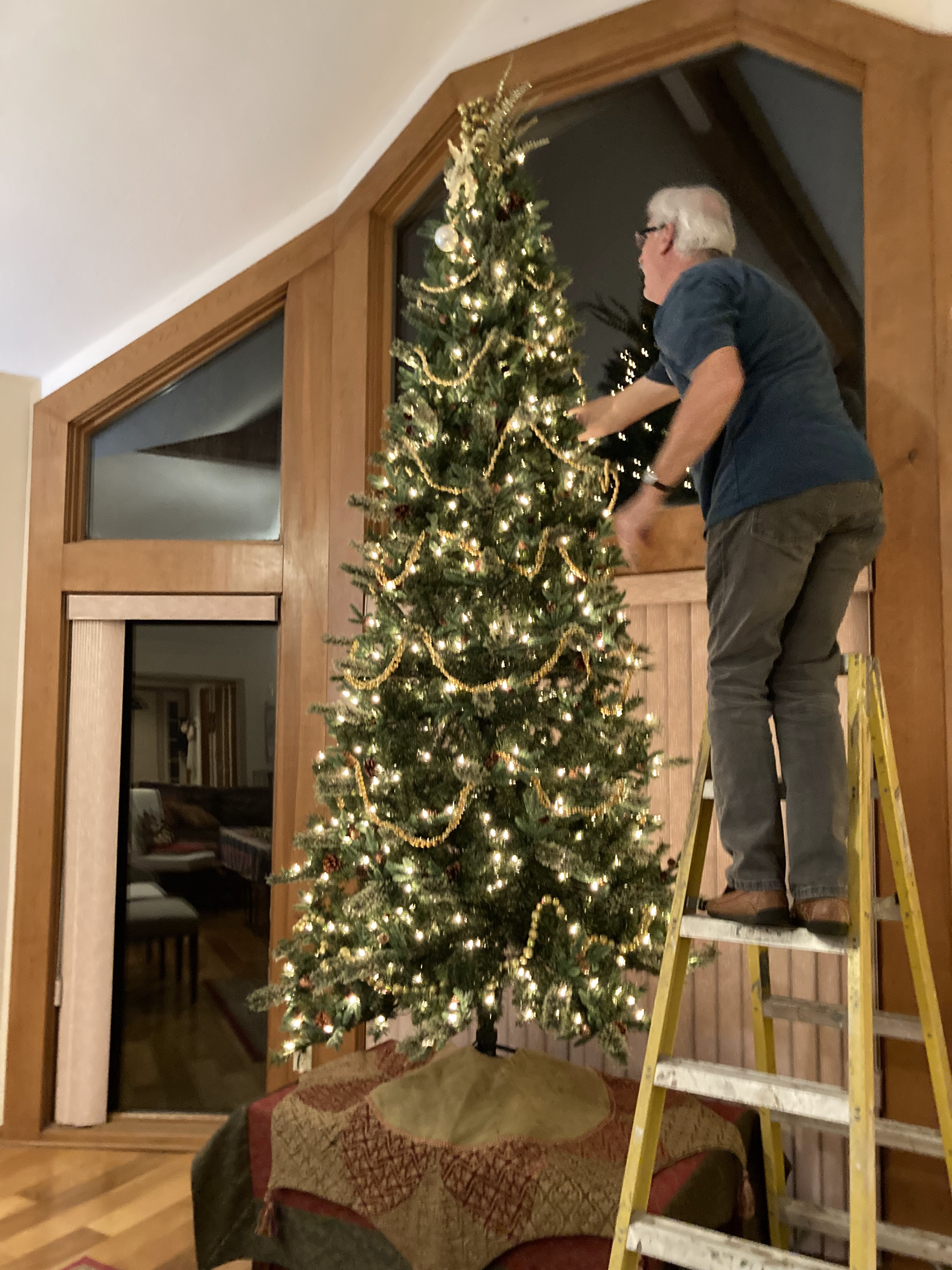 Lights and heights!! Paul sets up our new 9 foot Christmas tree passed on to us by a dear friend whose current house cannot handle such a tall tree.