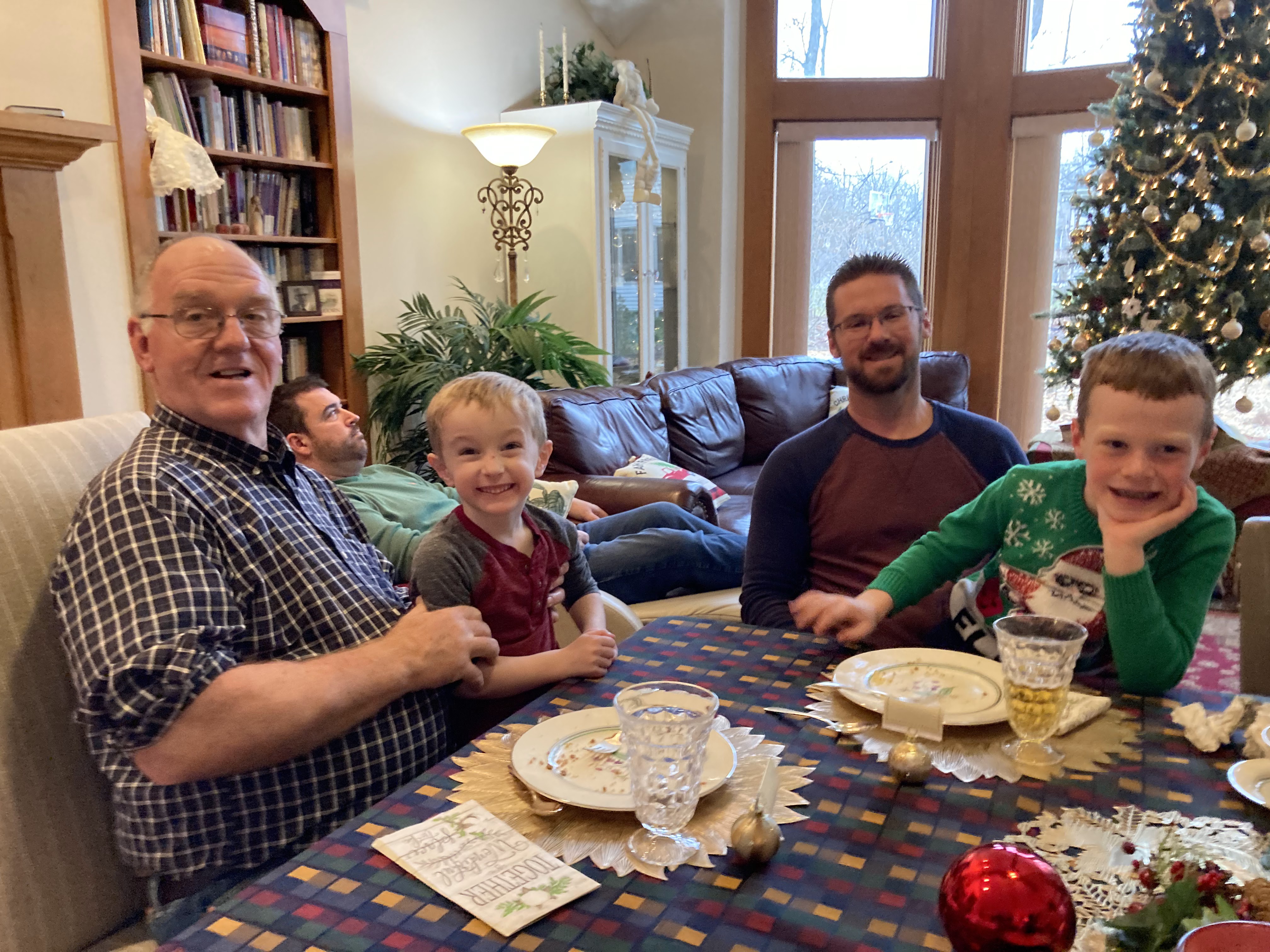 Brunch is over! Cameron sits on Grandpa Quick’s lap and Silas is by his dad (my nephew, Micah, a son of Grandpa Quick and my sister, Lanie).