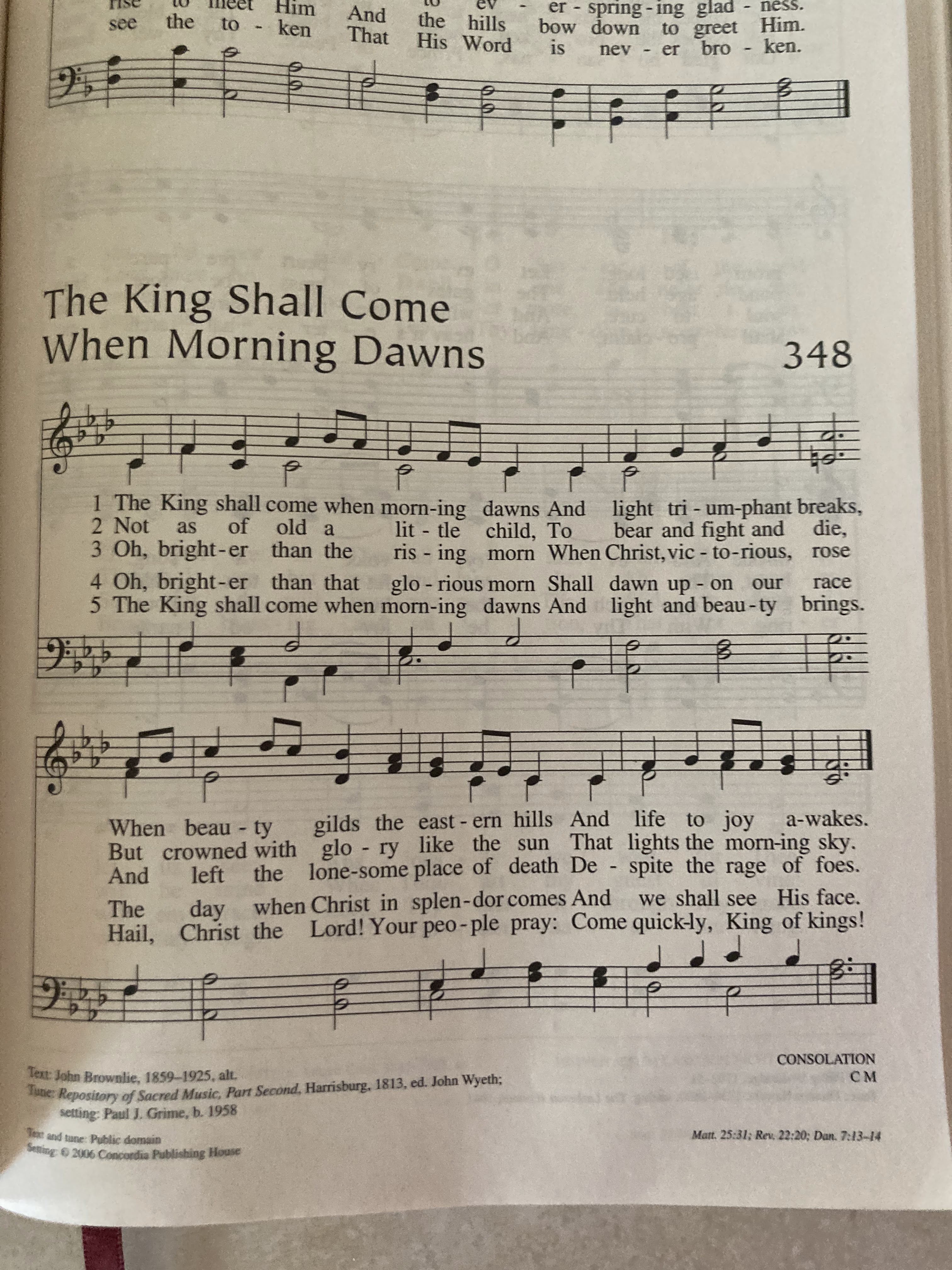 The Advent devotional I obtained at Concordia Theological Seminary a few miles south of our home here in Fort Wayne includes this lovely hymn entitled “The King Shall Come When Morning Dawns.” The words caught my attention with their beautifully shaped picture of biblical truth, but I was nearly mesmerized when I sat at my piano playing and singing the music, over and over. My ears and heart heard a stunning blend of melancholy and majestic joy.