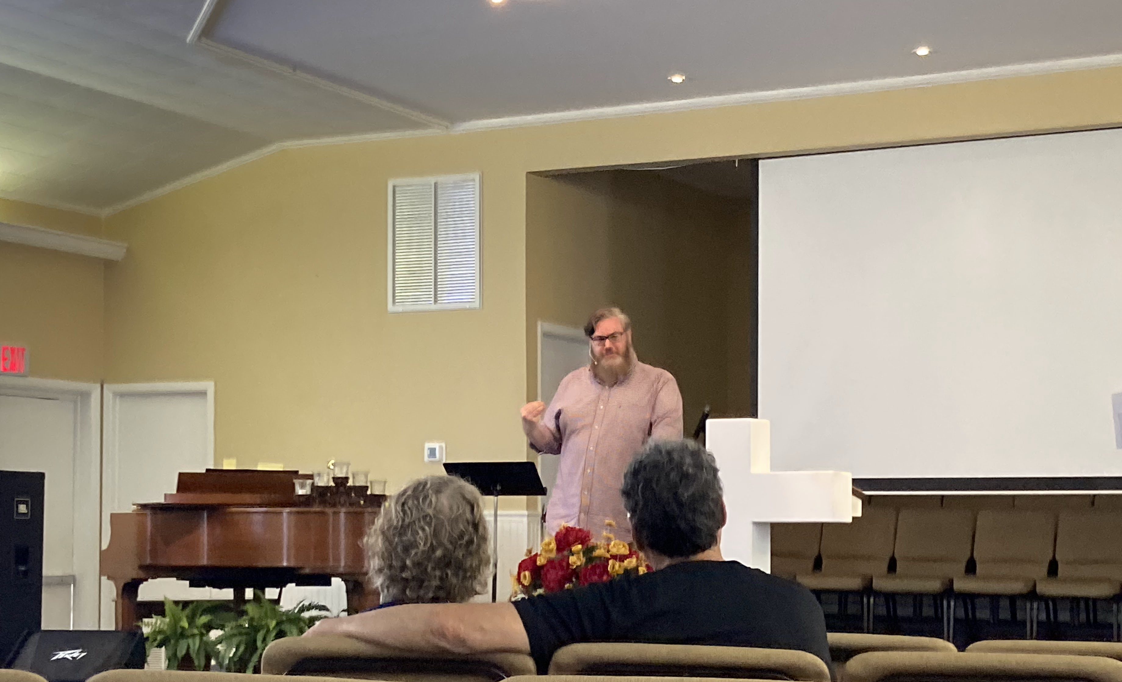I appreciated several things about his preaching approach. First, he teaches through the Bible, book by book, chapter by chapter. That way, he can’t pick and choose his topics, avoiding what he’s uncomfortable with. Next, I really like that he gave his congregation homework. He expected them to be prepared. Each week he assigned the given chapter (not that he got through a whole chapter in a sermon) to be read every day that week. Read the chapter (whatever chapter he was preaching from) every day. Study it. He encouraged people to know it better than he did. On a few occasions, someone had a comment to make during the sermon. The people were attentive.