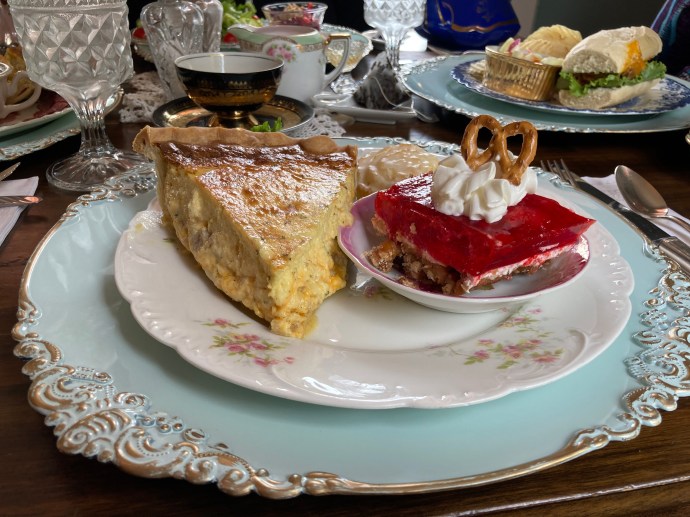 On the last full day of their visit, Paul escorted us in his cream-colored Ford F 150 (so roomy and comfortable) to a little town outside of Fort Wayne named Roanoke, a thirty minute trip. We had reservations to eat at the Parker Grace Tea Room, which is a brick, Victorian house with white trim turned into a tea room and gift shop. Even Paul likes to eat their. As Paul declares, “Real men eat quiche.”