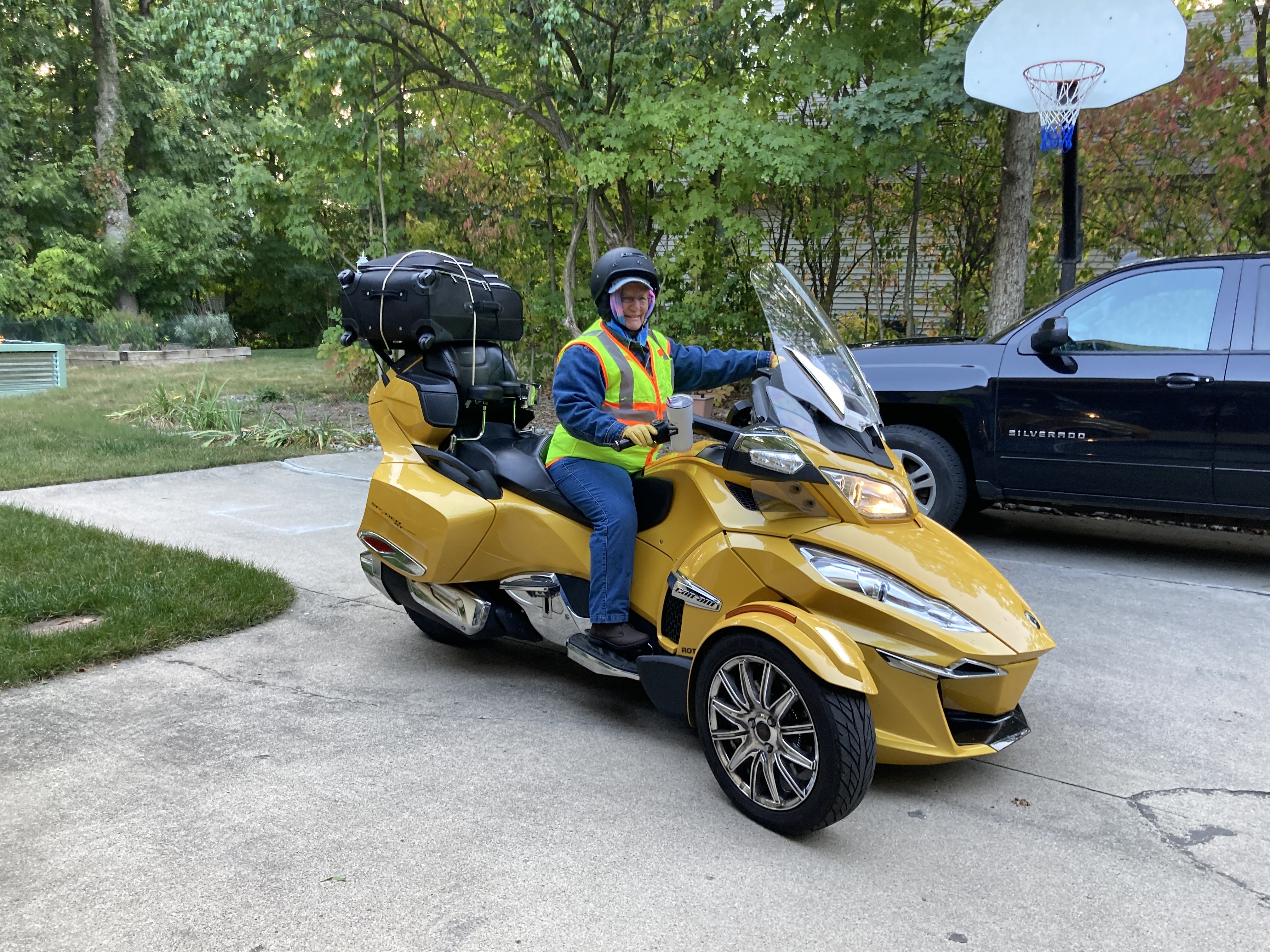 That’s a yellow, Can-Am Spyder RT. You see Sandy’s face in the mirror. This is her bike!