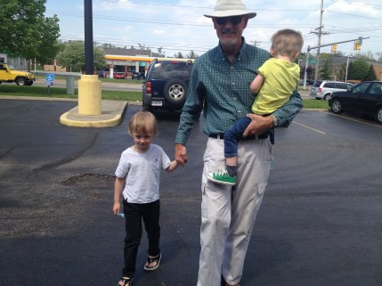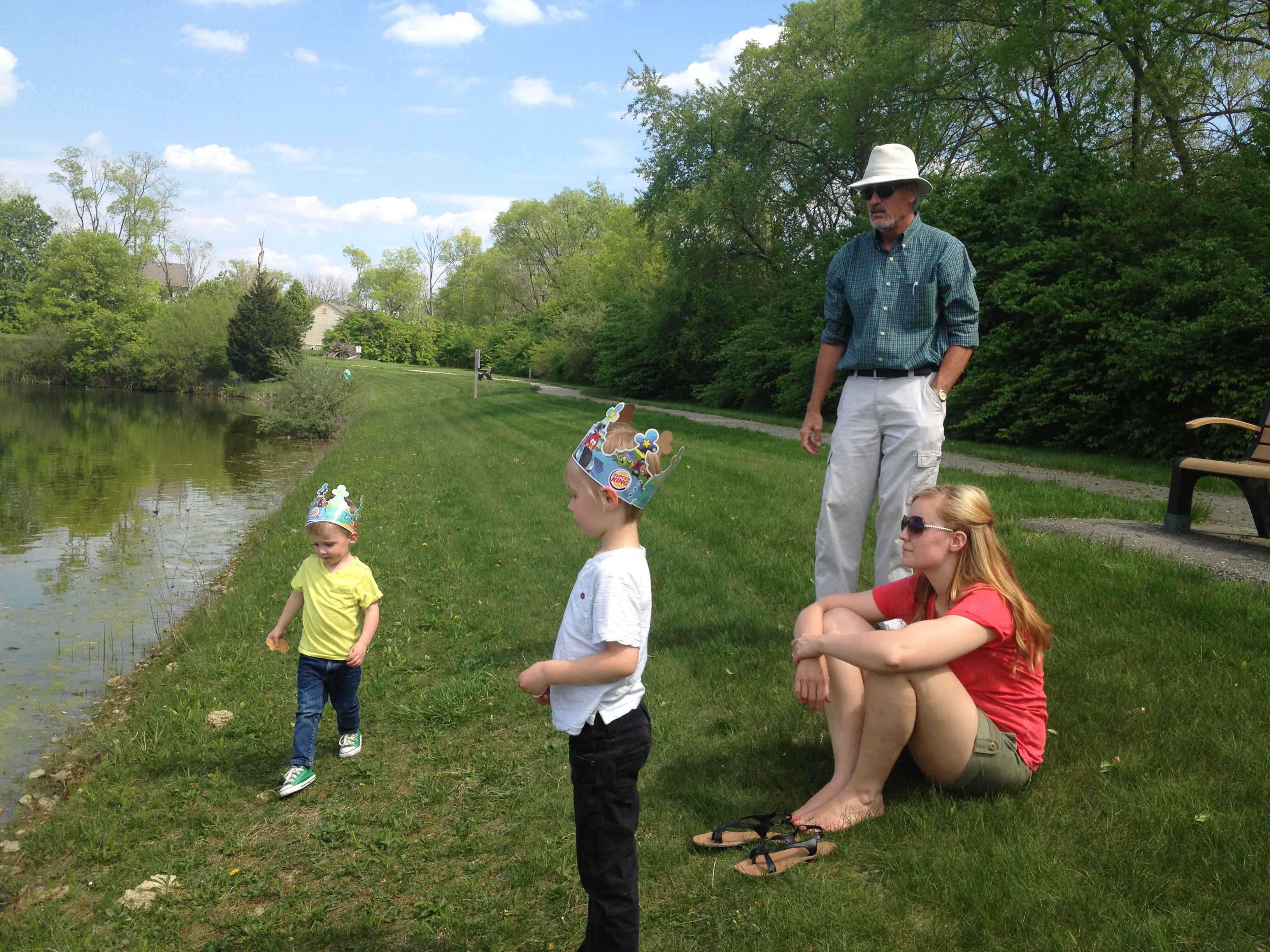 Our grandsons, Ryland and Aiden with Papa O and their mother, our daughter, Charissa. Feeding bread crumbs to the duckless pond. Come back here, ducks! Note the Burger King crowns!
