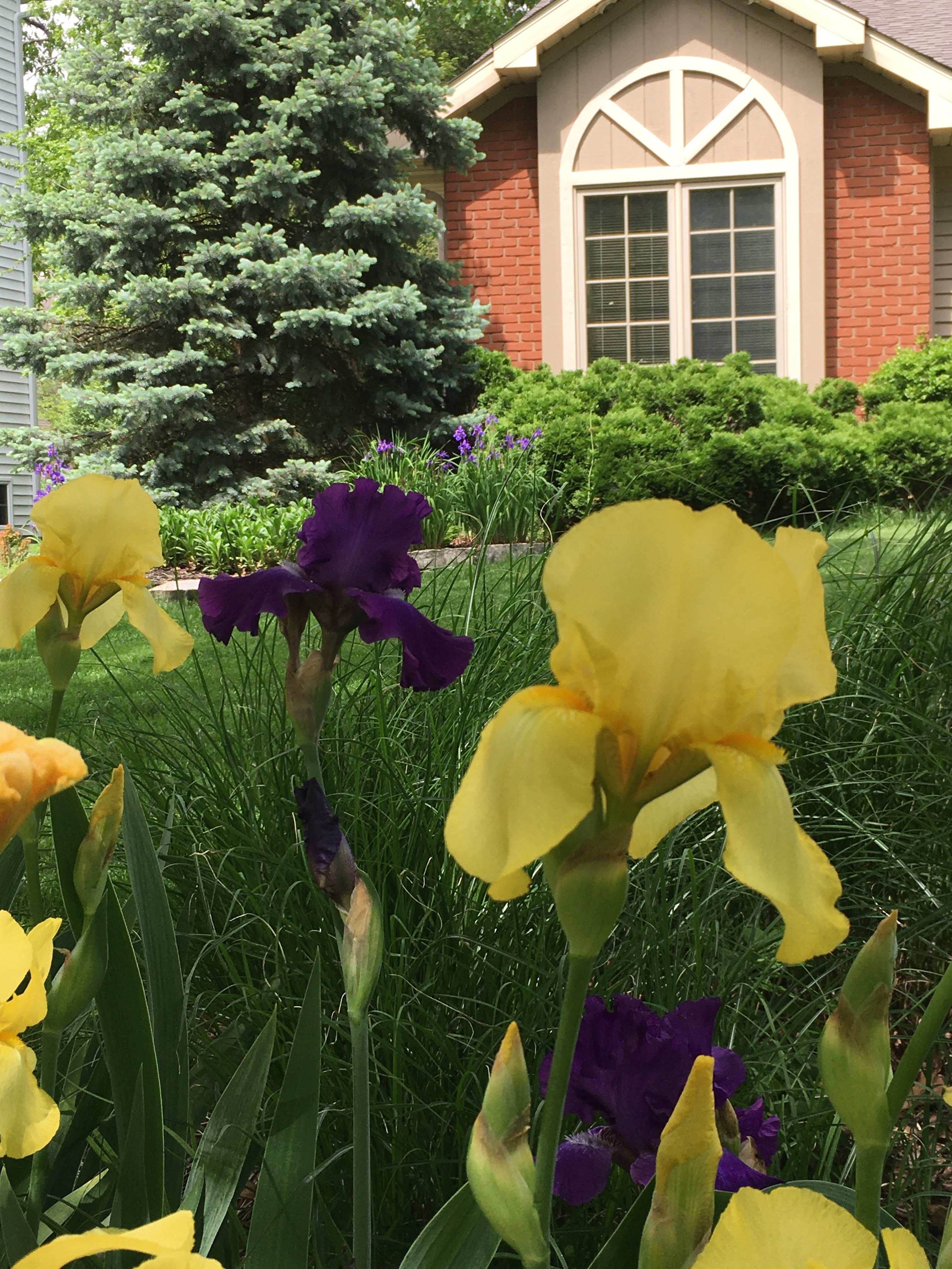 Irises pleasantly sway in our front lawn. “Consider the…irises.” (I have no lilies blooming now to consider.)